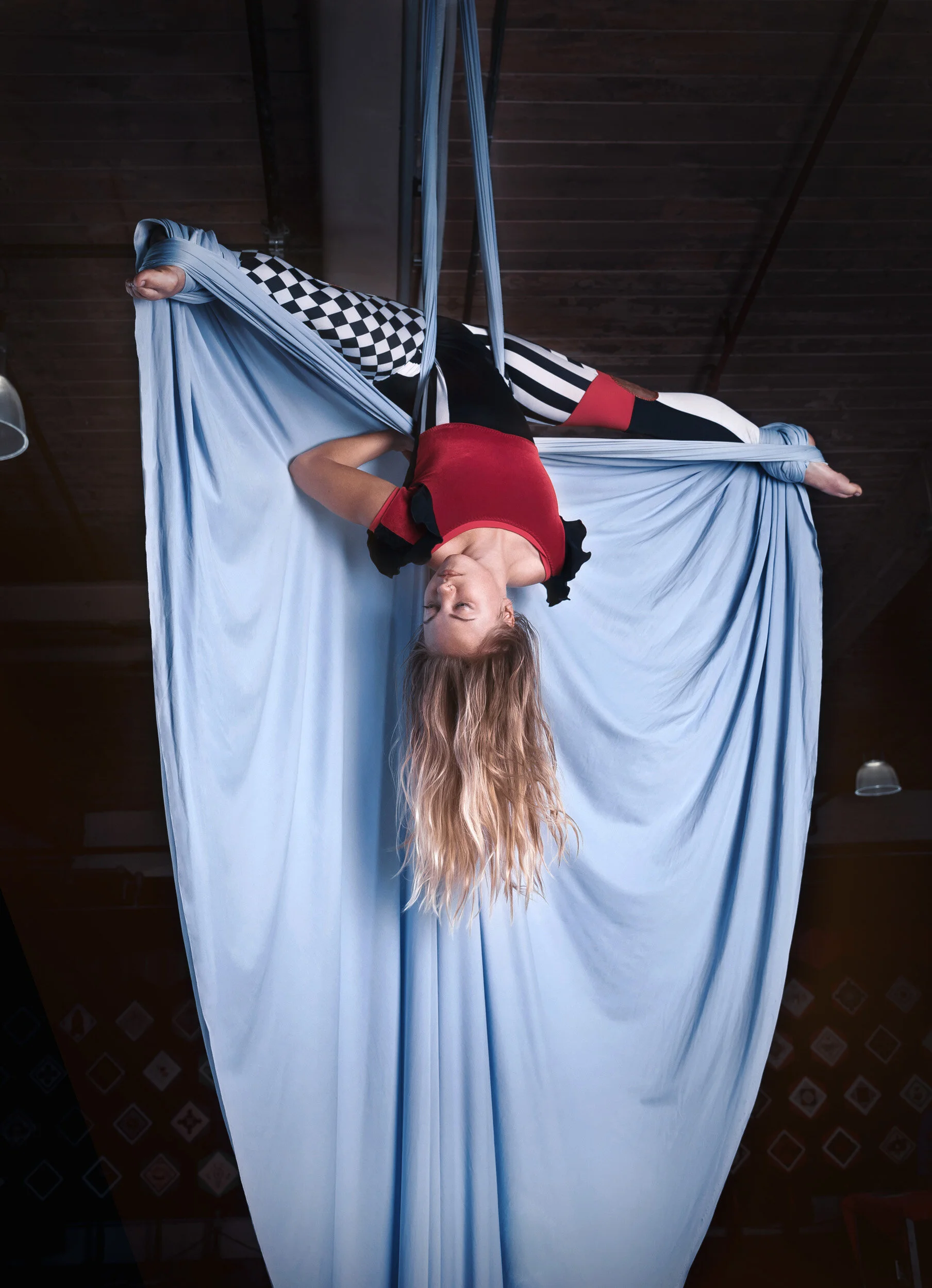 Molly Kubes is an aerial performer with a gymnast background. “Aerial is an outlet that allows me to explore my passion for gymnastics and acrobatics while performing and creating a community rather than competition.” - Molly
